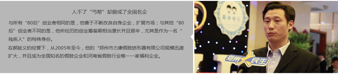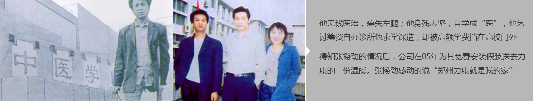 鄭州市力康假肢矯形器有限公司(簡稱力康),是一家專業(yè)從事假肢矯形器的設(shè)計、研發(fā)、制作及裝 配的專業(yè)機(jī)構(gòu)。成立于1992年是河南省唯一一家福利企業(yè)。力康下設(shè)業(yè)務(wù)部、技術(shù)部、住院部、康復(fù) 部、售后服務(wù)部,并配有現(xiàn)代化的裝配車間和功能齊全的訓(xùn)練大廳,為殘疾朋友康復(fù)訓(xùn)練提供了可靠 保障??偨?jīng)理穿戴假肢多年,有著豐富的臨床經(jīng)驗和親身體會;多年來,力康已為全國幾十萬名殘疾 朋友安裝上舒適、美觀、耐用的假肢和矯形器具,使他們更大限度地恢復(fù)了正常的工作和生活。“產(chǎn) 品即人品”的質(zhì)量理念、先進(jìn)的技術(shù)、實惠的價格、完善的售后服務(wù)是力康取勝的法寶……